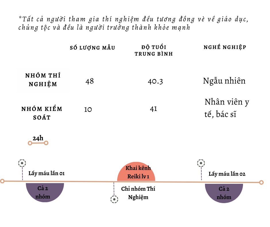 Bà đặt giả định sau khi được khai kênh Reiki, cơ thể học viên sẽ có sự thay đổi lớn trong khả năng mang oxy của hồng cầu trong khoảng thời gian 24h, được thể hiện bằng các chỉ số huyết sắc tố haemoglobin và dung tích hồng cầu hematocrit (HCT) trong máu. Thông thường, máu của con người gồm 3 thành phần: tế bào hồng cầu; bạch cầu, tiểu cầu và huyết tương. Xét nghiệm HCT sẽ cho biết % các tế bào hồng cầu trong máu của bạn. Và trong các tế bào hồng cầu lại chứa một loại protein gọi là hemoglobin (HgB).