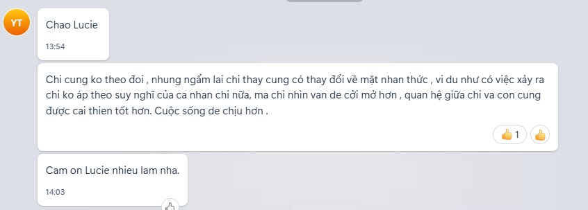 Góc tự hào: Lucie còn đặc biệt góp phần biên dịch biên tập giáo trình của phương pháp ra tiếng Việt để lan tỏa công cụ mạnh mẽ này đến cộng đồng. Đặc biệt hai người phụ nữ tuyệt vời đã nhận truyền dẫn từ mẹ Quan Âm để từng bước lan tỏa MH cho Trái Đất là bà Rev. Gisèle King và Kathryn Anderson đều là Reiki Master. Là những nhà trị liệu năng lượng tài năng và cũng là thầy của những người thầy. Lucie cảm thấy thật vinh dự và gắn kết mạnh mẽ khi bản thân cũng là một Reiki Master, cũng đã lắng nghe tiếng gọi cao hơn để đi trên con đường phụng sự ánh sáng như các vị tiền nhân. Lành thay!