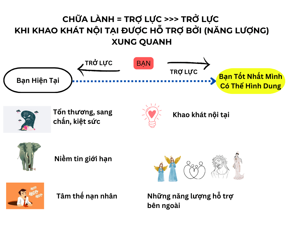 - Khi làm bất kỳ việc gì, luôn có lực cản và lực hỗ trợ. Hành trình chữa lành chỉ diễn ra khi = Trợ Lực >>> Trở Lực.
