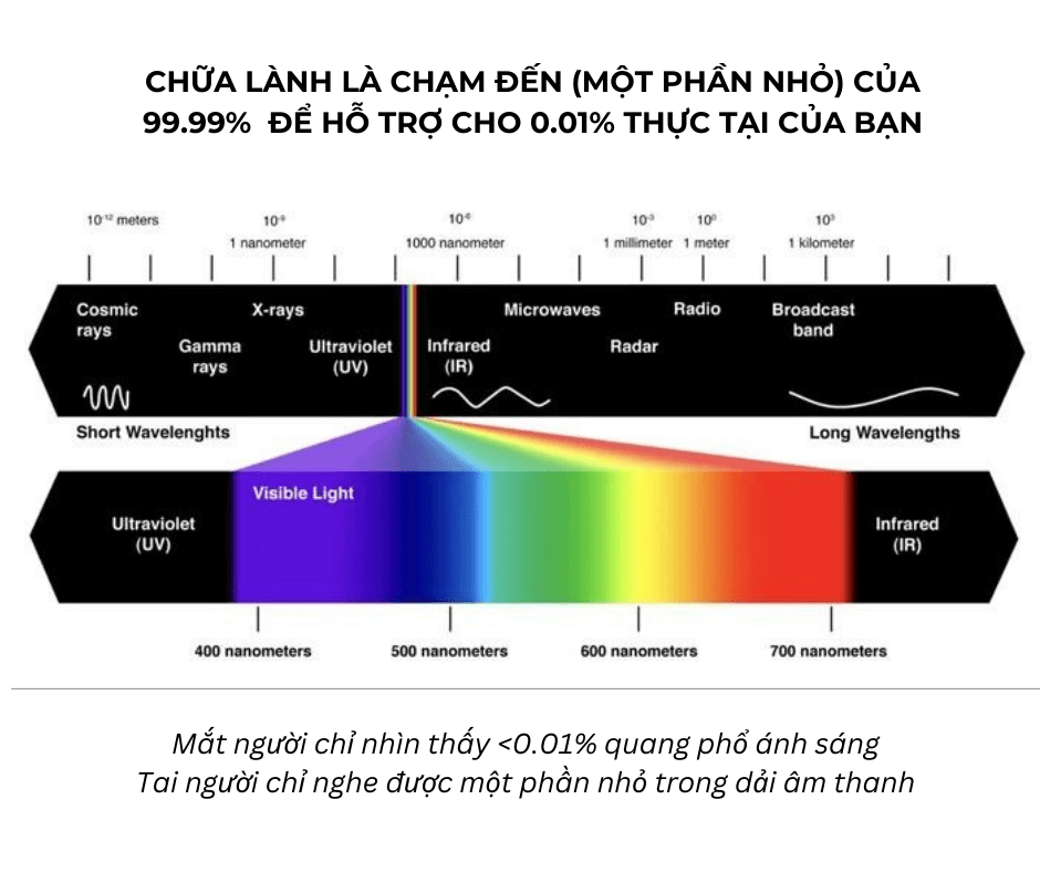 Và khi sử dụng chữa lành năng lượng, chúng ta chạm đến (một phần rất nhỏ) của 99.99% này, chạm đến trí tuệ, sức mạnh, kiến thức, kĩ năng…của nó để chữa lành, để giải quyết cho 0.01% vấn đề ở thực tại này của chúng ta. See the huge impact?