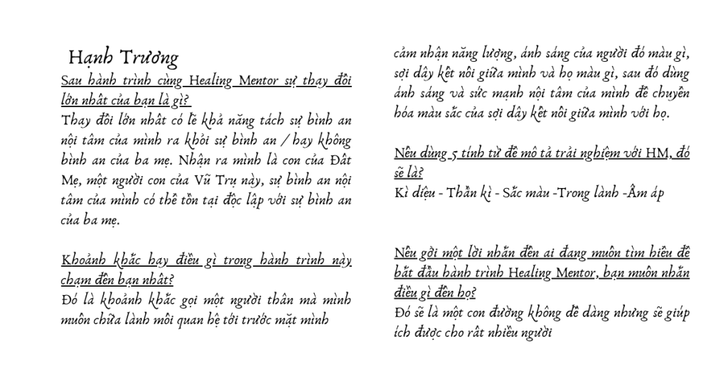 - Gởi bạn ghi chú các thông điệp, quan sát sau mỗi session để neo năng lượng và quan sát hành trình chuyển hóa