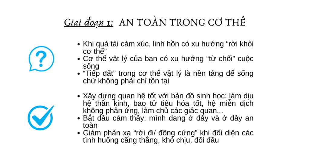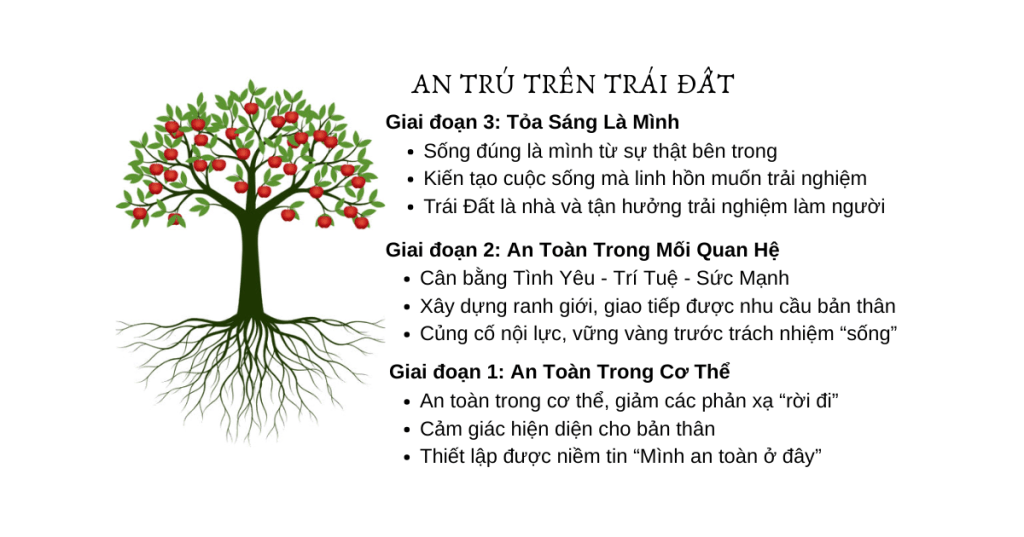 An Trú Trên Trái Đất đi qua 03 giai đoạn gồm 09 session chữa lành năng lượng, phát triển tâm thức. Hành trình đi theo nhịp điệu của bạn, hỗ trợ bạn từng bước hạ cánh an toàn để an trú vững vàng trong cuộc sống của mình. (Click để xem ảnh phóng lớn)