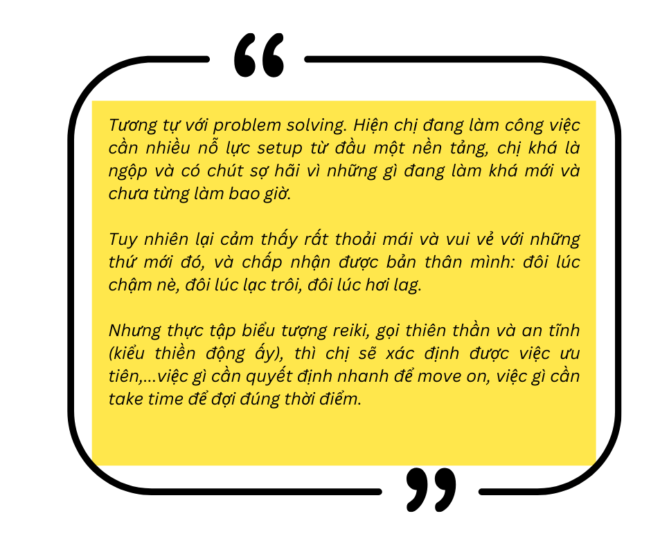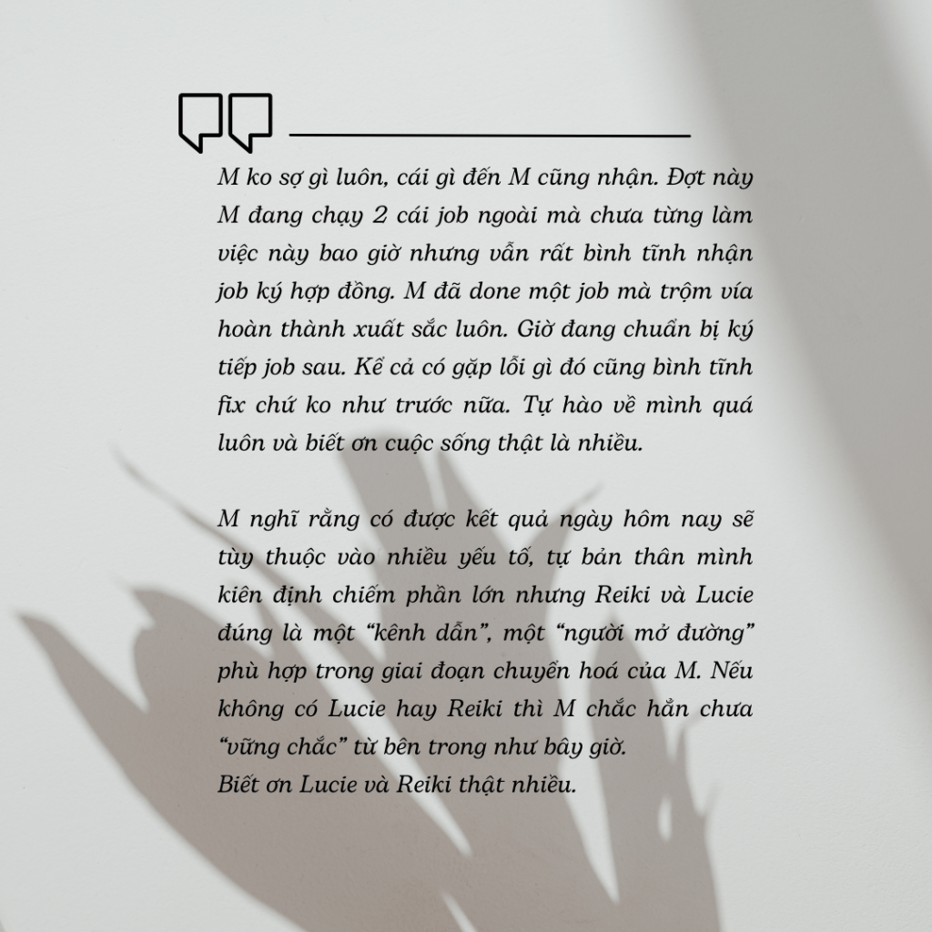 Không chỉ học Reiki, Reiki Retreat của Lucie còn đặc biệt nhất thị trường khi hướng dẫn bạn cách kết nối lắng nghe thông điệp chỉ dẫn (divination). Và được nhận sự chữa lành trực tiếp mạnh mẽ từ chính Lucie cho mỗi học viên trong suốt 2 ngày cùng nhau. Các học viên Reiki Retreat của Lucie đều chia sẻ về sự chuyển hóa cá nhân mạnh mẽ sau đó.