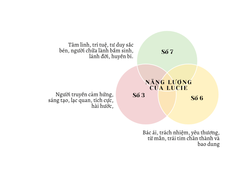 Trong thần số học, Lucie có đến 3 con số chủ đạo: số 7 – số 3 và số 6 (từ con số 33/6) Từ đó thể hiện những tính cách và vai trò khác nhau ở những phương diện khác nhau của cuộc sống. Tiếp theo là những công cụ chữa lành năng lượng mạnh mẽ như Reiki, Magnified Healing, Akashic Healing mà Lucie đã thực hành trong hơn 3 năm qua cũng như nghiêm túc phát triển bản thân trên con đường phụng sự và phát triển tâm linh.